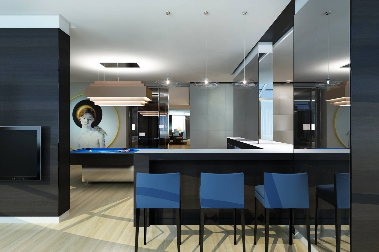 Дизайн бильярдной в оттенках графита и лазури
