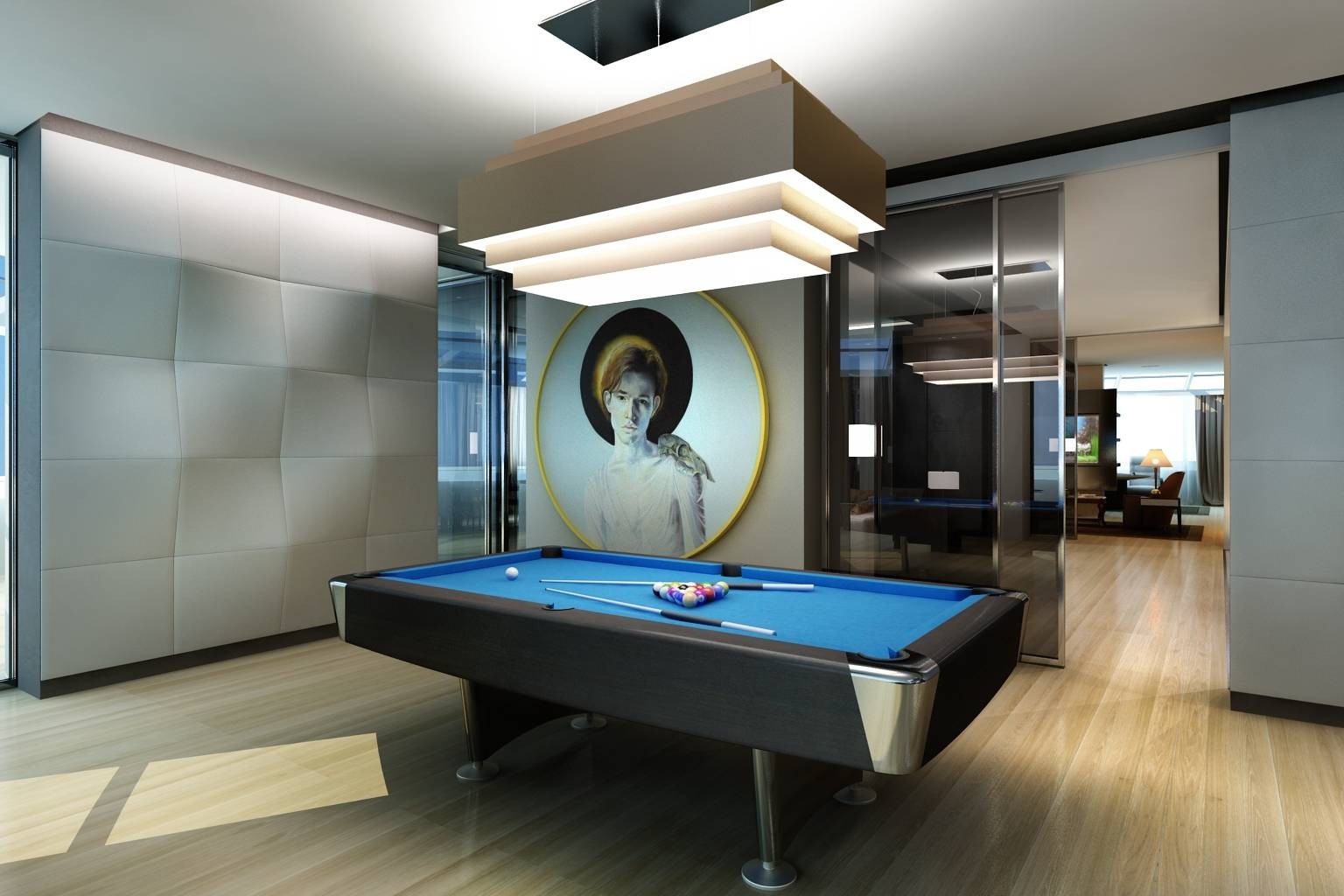 Дизайн бильярдной комнаты с большой люстрой