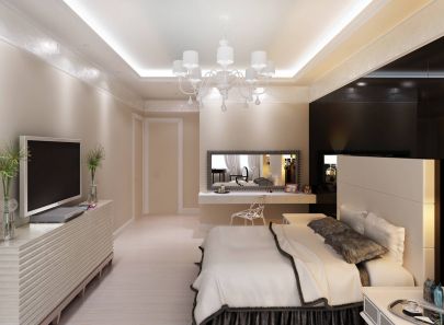 Интерьер спальни также выдержан в светлых оттенках, но с добавлением контрастных включений: стена за изголовьем кровати отделана черной глянцевой панелью, контрастная отделка использована и в текстиле, и в элементах мебели.