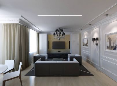 Презентационная зона гостиной объединяет место для отдыха – с диванной группой светло-серых оттенков и обеденную группу, расположенную в эркерном выступе, перед широким окном. Каждая из зон имеет собственное освещение.