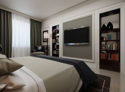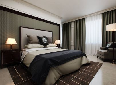В дизайне спальни – предельное внимание к деталям. На окнах тяжелые портьеры изумрудного оттенка в мелкую английскую клетку, такой же тканью обтянута стена за изголовьем кровати и в зоне ТВ. Со светлыми стенами и потолком контрастируют темные коричневые цвета прикроватных тумб, стеллажей, паспарту с фотографиями.