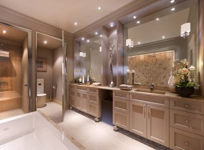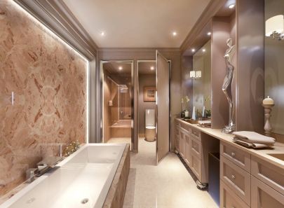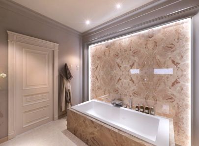 Отделка под мрамор в бежевых тонах делает интерьер ванной комнаты достойным продолжением классических традиций.