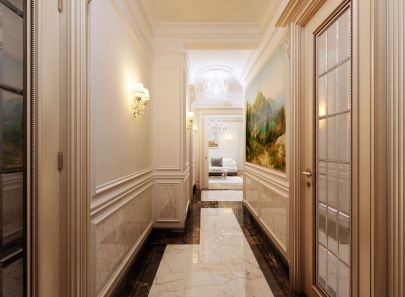 Светлую основу интерьера расцвечивают картины, яркими акцентами развешанные на стенах. Сочетание бежевой и темно-коричневой напольной плитки под мрамор помогло обыграть сложную геометрию коридора, ведущего из прихожей в комнаты. Отделка под мрамор повторяется и по низу стен.