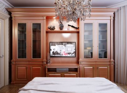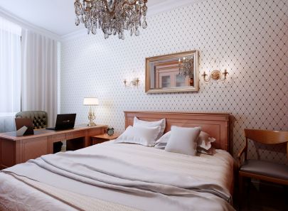 Стены хозяйской спальни декорированы обоями с классическим рисунком. Мебель из темного дерева – строгих форм, ее коллекция включает и рабочее место у окна. Интерьер гостевой спальни получил более нежную персиковую гамму. Стены здесь окрашены и оклеены обоями в обрамлении молдингов.