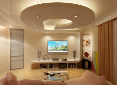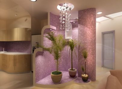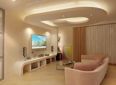 Гостиную отделяет от прихожей и кухни угловая перегородка, выполненная в виде стилизованных волн разной высоты и отделанная мозаикой. В зоне домашнего кинотеатра под плазменной панелью располагается длинная узкая полка, которая с помощью эффектного декоративного приема плавно переходит в подвесную радиальную конструкцию в центре потолка.