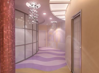 Оттенок нежной сирени и светло-фиалковый задают настроение уже в прихожей. Раскладка цветной плитки и м итирует здесь движение волн, выбранная га мма повторяется в фактурной настенной надписи. Оформленный фальш-балками и точечно подсвеченный потолок подчеркивает плавный изгиб стены, ведущей в гостиную.