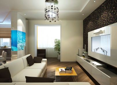 В перегородку, отделяющую столовую от гостиной, вмонтирован аквариум, что позволило не выделять для него дополнительную площадь.