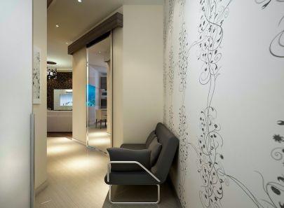 Столовая и коридор располагаются относительно гостиной по диагонали, что дает возможность обустроить в коридоре необходимые шкафы-купе. Их зеркальные двери раздвигают объем помещения. В столовой эту задачу выполняет зеркальная поверхность стены, расположенной напротив обеденного стола.