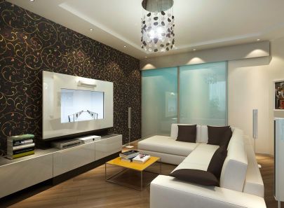Стена за плазменной панелью в интерьере гостиной студии отделана обоями густого шоколадного оттенка. Этот же цвет повторяется в оформлении диванных подушек, столешницы обеденного стола, фасада кухонного гарнитура. Темный цвет выразительно играет на контрасте с молочными оттенками стен и потолка.