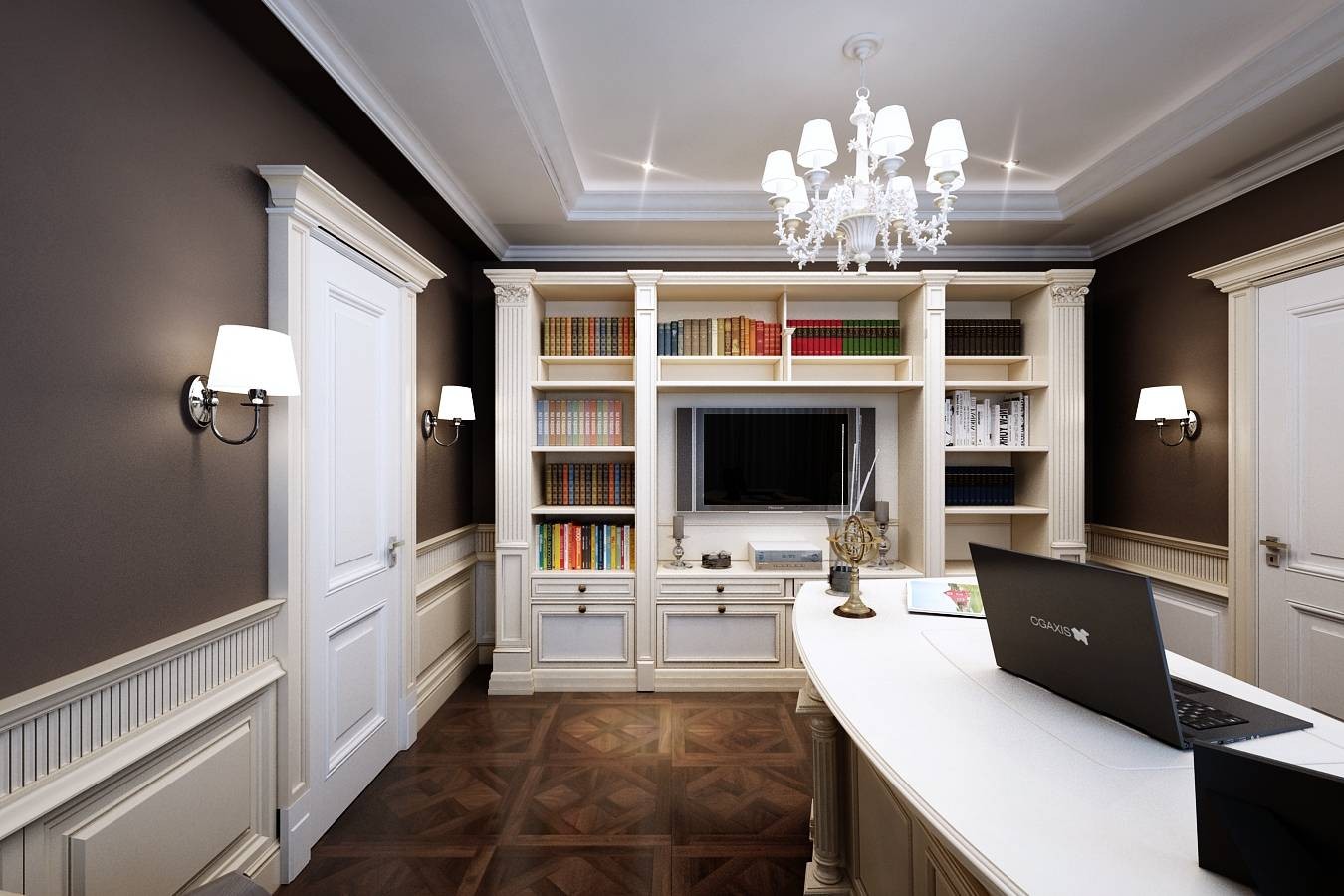 Темные полы в светлом дизайне кабинета