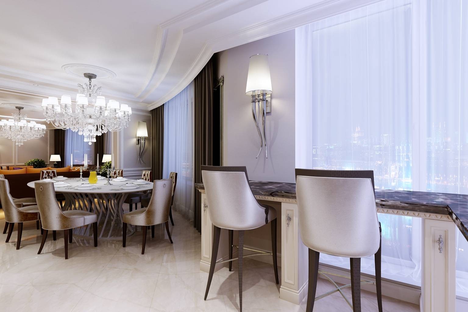 Темные шторы в светлом интерьере столовой