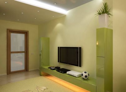Фисташковые и оливковые оттенки стали основой цветового оформления интерьера детской комнаты. На потолке здесь симметрично расположены подвесные конструкции, между которыми проступает поверхность, расписанная в виде неба.