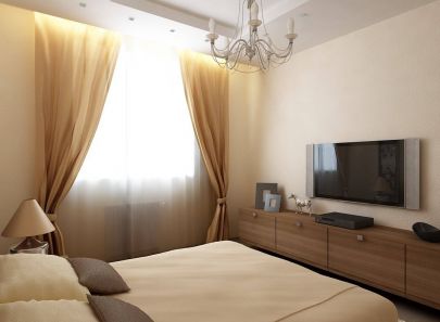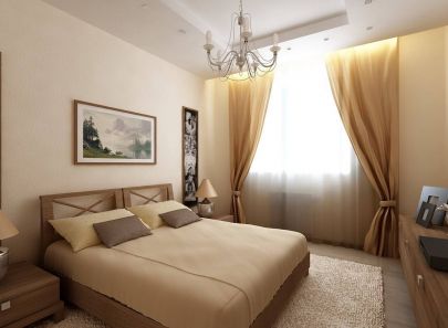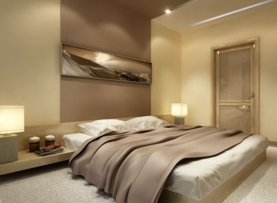 Разные оттенки коричневого позволили акцентировать отдельные зоны в спальной комнате. Стена за изголовьем покрашена в густой кофейный цвет, переходящий на потолок. Ярким образным элементом в простом дизайне второй спальни стали фотоколлажи, развешенные по обеим сторонам от кровати.