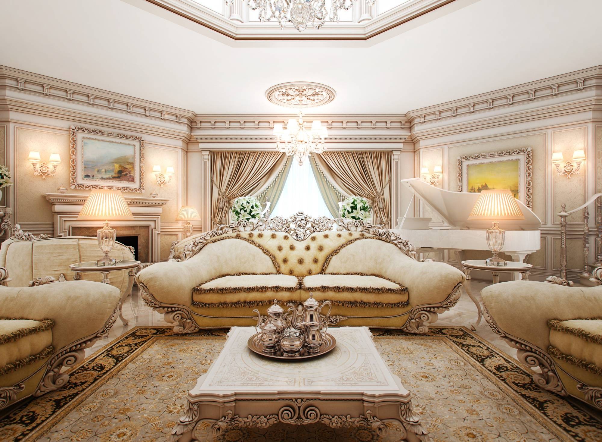 Классический светлый интерьер гостиной с пианино