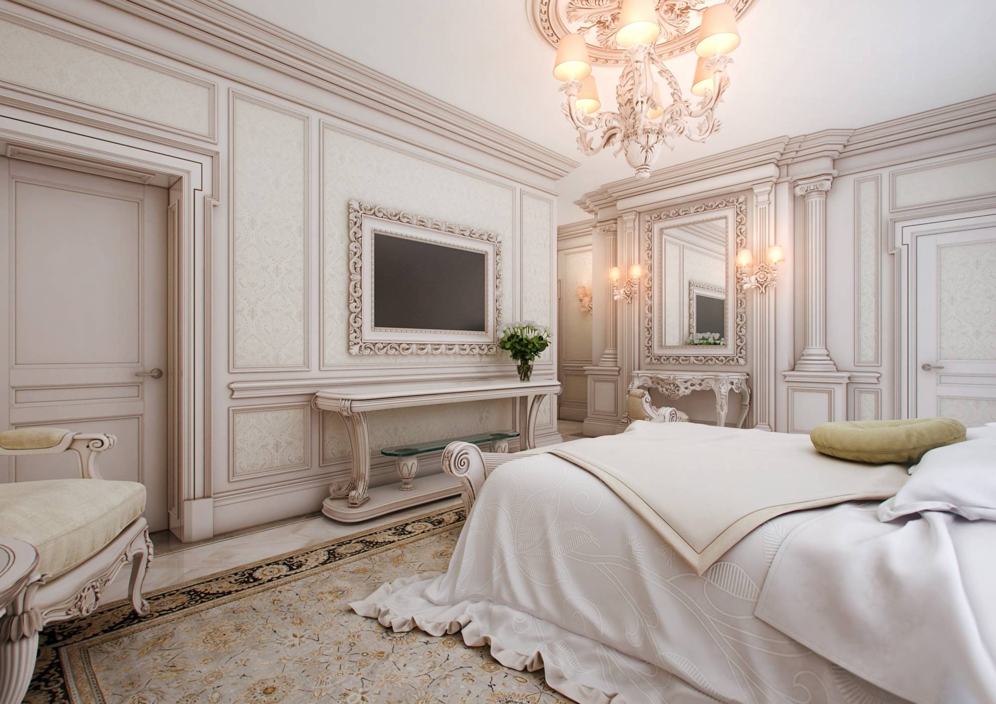 Роскошный интерьер светлой спальни в классике