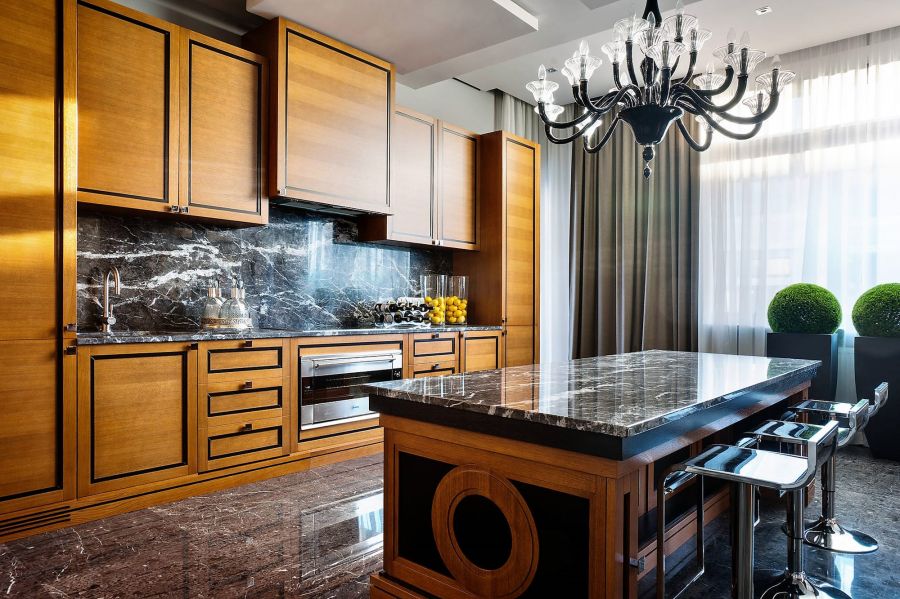 Деревянный кухонный гарнитур с глухими фасадами смотрится сдержанно и одновременно шикарно – за счет черного декора, передающего симметричность композиции. Впечатление поддерживают темно-серые мраморные столешницы, каменная облицовка пола и фартука.