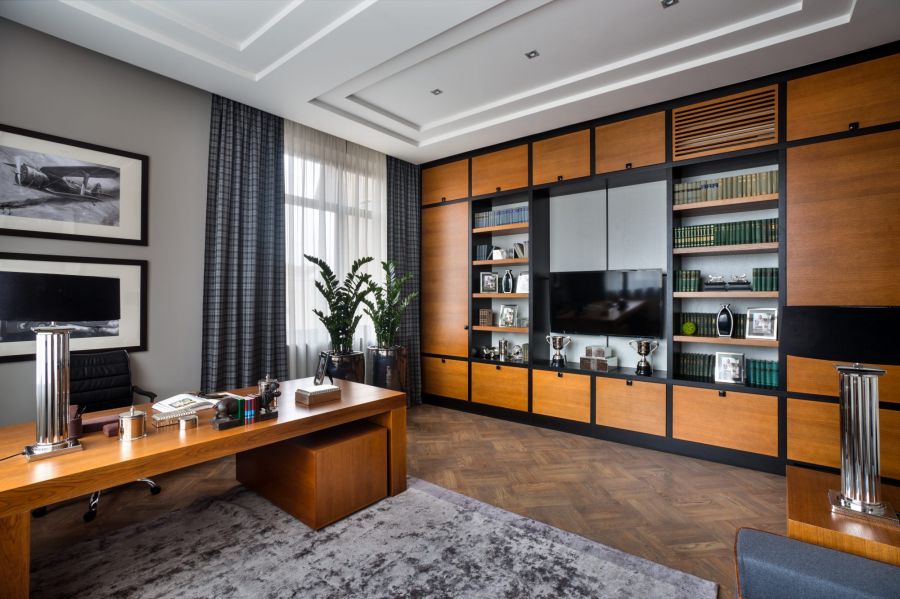 Собственное рабочее место есть и в просторной библиотеке, для которой в элитной квартире предусмотрена отдельная комната. Встроенные книжные стеллажи – простые по форме и не нуждаются в каком-либо декоре. Нарядный акцент вносят белые кресла.