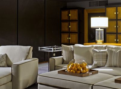 Обозначает логический центр планировки, имеет удобную коммуникацию с остальными комнатами на первом уровне пентхауса и выход в холл. Это место для приема гостей и отдыха большой компанией.