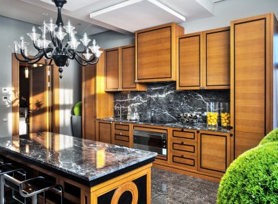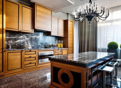 Деревянный кухонный гарнитур с глухими фасадами смотрится сдержанно и одновременно шикарно – за счет черного декора, передающего симметричность композиции. Впечатление поддерживают темно-серые мраморные столешницы, каменная облицовка пола и фартука.
