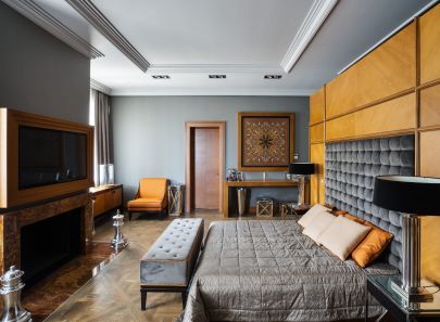 Планировка современного пентхауса с двумя уровнями отводит для хозяйской спальни комнату на верхнем этаже – с широким простенком между окнами. Эта архитектурная особенность позволила установить здесь декоративный камин. Мраморное обрамление портала дублируется такой же, только деревянной рамой для телевизора. Лицом к медиа-зоне расположена двуспальная кровать с роскошным бархатным изголовьем и такой же банкеткой в ногах. Сплошная деревянная консоль вокруг изголовья своими коричнево-медовыми оттенками уравновешивает дымчато-серый цвет в отделке стен и текстиля.
