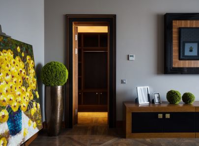 В ходе ремонта по дизайн-проекту двухуровневого пентхауса отделана двусветная спа-зона с бассейном, джакузи, площадкой для шезлонгов. Реализовать подобное решение позволила технически продуманная организация вентиляции и обогрева. Оформление атриума повторяет главные мотивы: серая керамическая плитка комбинируется с ореховыми деревянными панелями.
