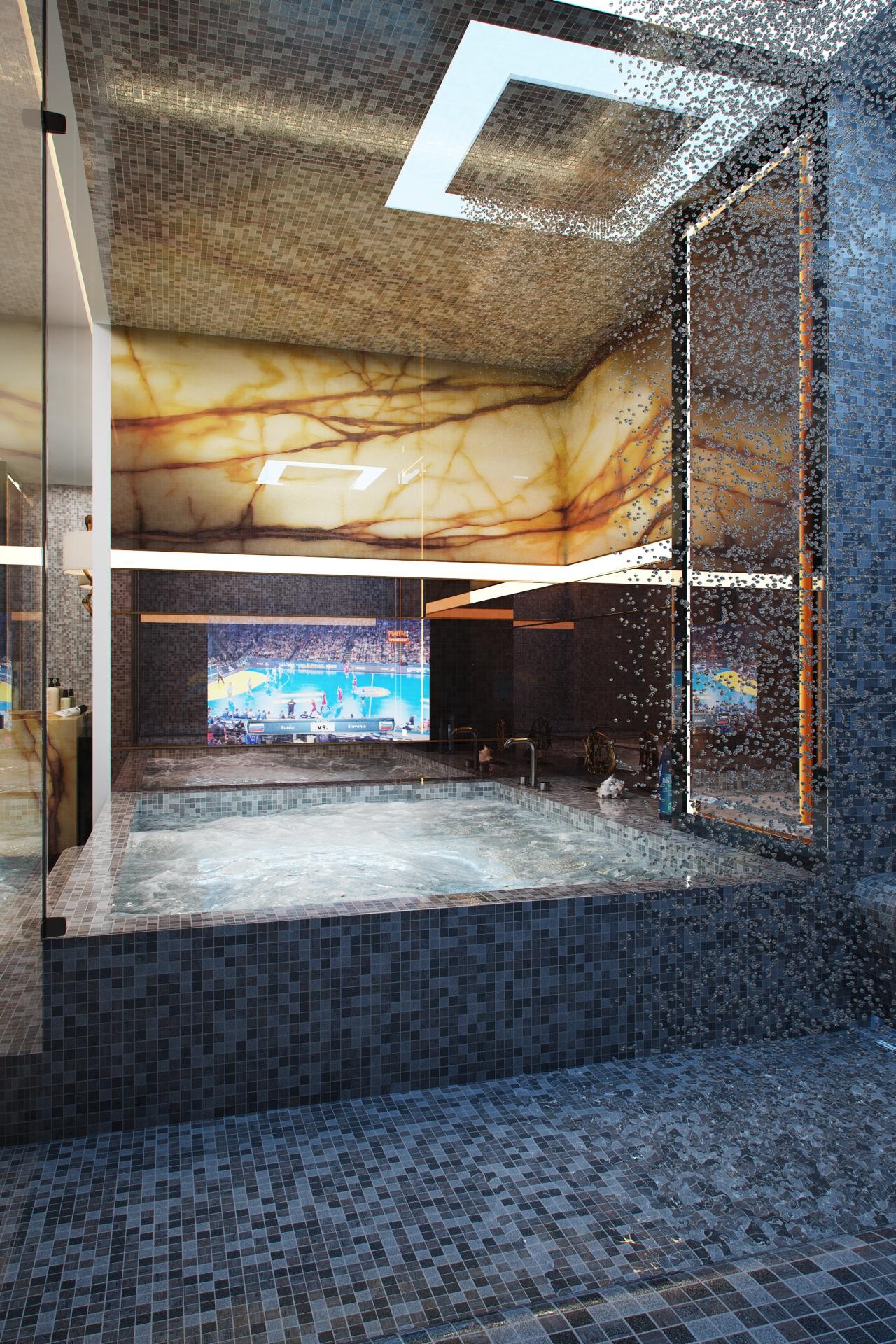 Дизайн ванной комнаты с большой квадратной ванной