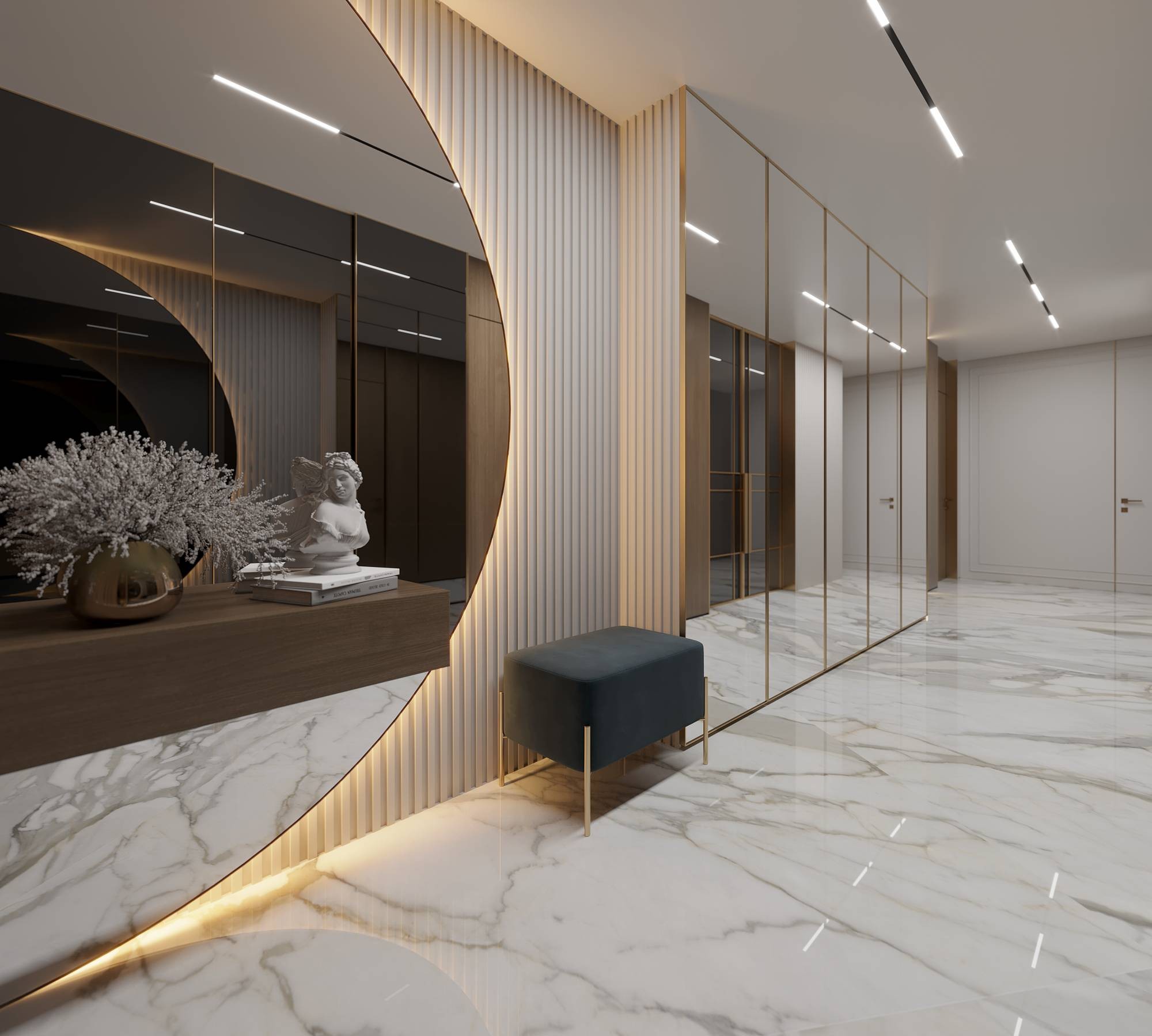 Банкетка и зеркала в дизайне прихожей