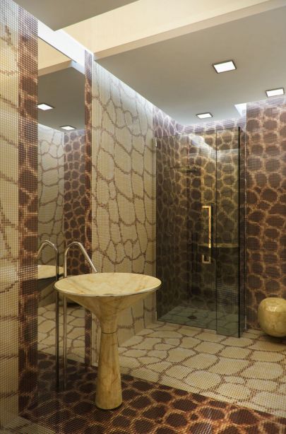 Выбранную тематику дизайн-проекта продолжает оформление кухонных фасадов и дизайн санузла: характерный рисунок здесь создает мозаика бежевых и темно-коричневых оттенков.