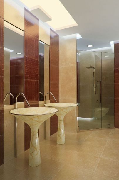 Мебель с рисунком кожи рептилии украшает и дизайн спальни. Изголовье отделано кожаными панелями с имитацией, как и стена позади кровати, декорированная рядом вертикальных зеркал. Во второй спальне зона кровати выделена на полу таким же приемом, как место для отдыха в гостиной.