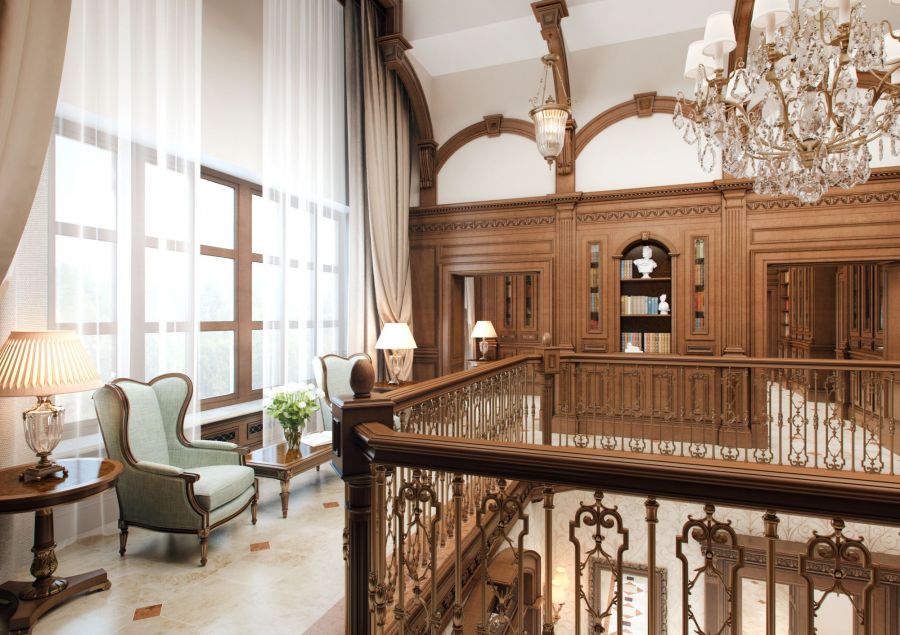 Еще один пример роскошного интерьера в классическом стиле – проект 3-х этажного дома с отделкой натуральным деревом. Темно-ореховые настенные панели, карнизы, дверные порталы, межэтажные лестницы, потолочные балки, книжные шкафы создают удивительно гармоничное сочетание с кремовыми обоями, позолоченными балюстрадами, светло-бежевым инкрустированным мраморным полом.