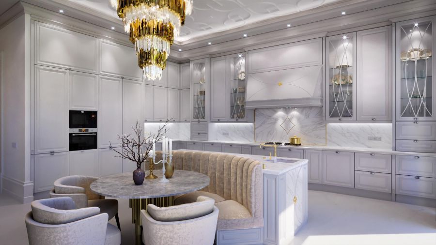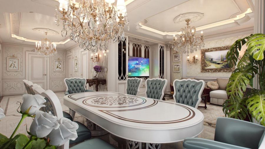 Пример оформления парадной столовой – из проекта интерьера дорогой квартиры в Москве на ул. Береговой. Аристократичная белая мебель обеденной группы: резные деревянные стулья с мягкой обивкой и декоративными кистями, круглый стол на массивном фигурном подстолье, высокие барные стулья с узорчатыми деревянными спинками – идеально дополнила дизайн классической кухни с мраморным орнаментальным полом, потолочными розетками, филенчатыми фасадами шкафов и многослойной драпировкой на окнах.