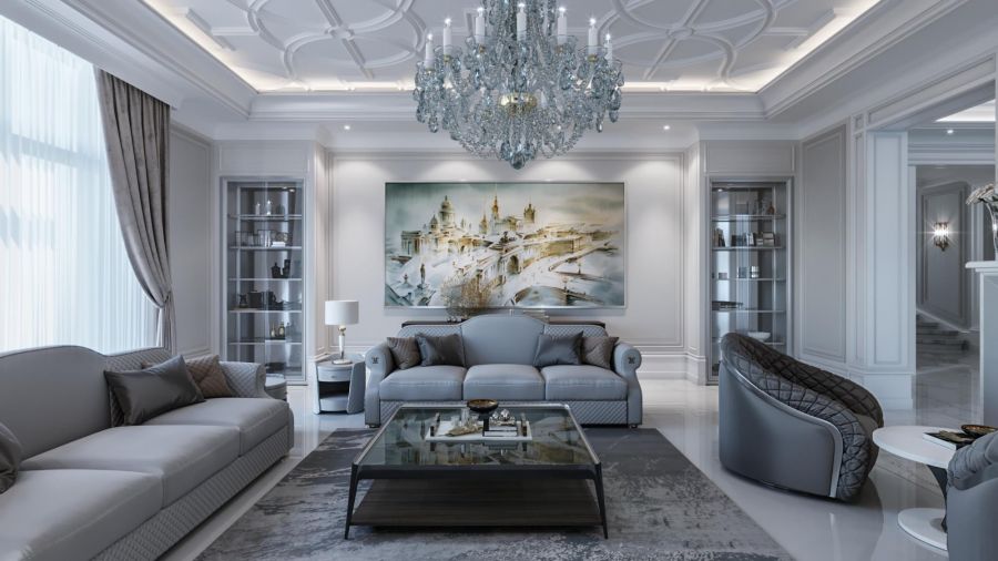 Элитные интерьеры дорогих домов реализуются на основе классики и современных стилей. В проекте дизайна частного дома в классическом стиле традиционная отделка стен молдингами и пилястрами, мраморная облицовка пола комбинируется с минималистичной мебелью, постерами, геометрическим декором потолка, ар-деко светильниками.