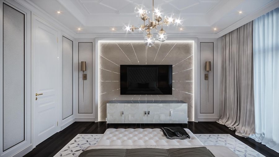 В проекте пентхауса в пастельных тонах этот принцип воплощается в каждом помещении. Например, в белой классической спальне с зеркальными стеновыми панелями.