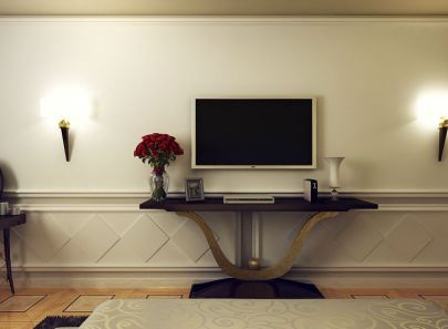 В элегантном интерьере дома или квартиры должна присутствовать легко различимая фокусная точка. Это объект (например, телевизор, камин, журнальный стол, оконный проем), относительно которого выстраивается остальная обстановка. Симметрия даст ощущение гармонии и красоты.