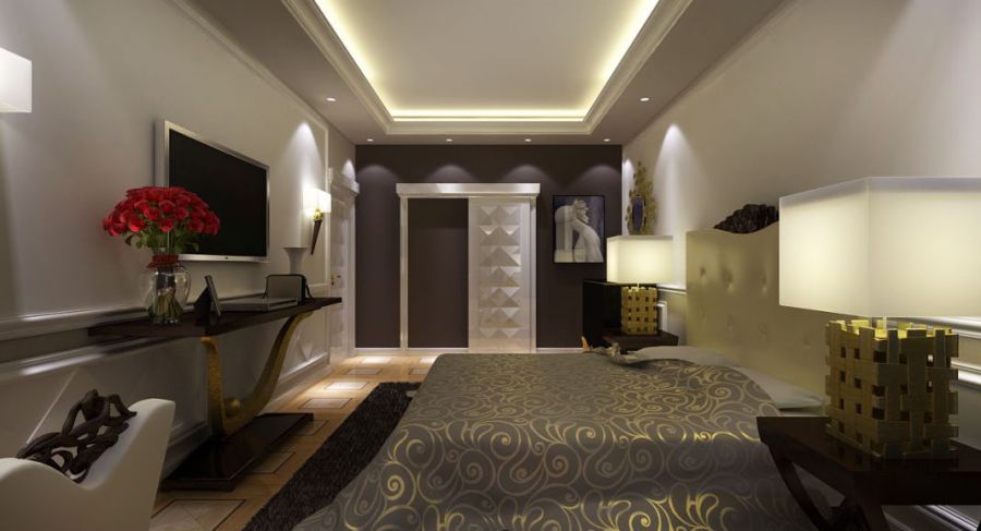 В роскошном интерьере квартиры спальная комната тоже получила дорогое оформление. Золотистый декор присутствует в отделке светильников, пристенной консоли, комода, круглого настенного зеркала. Изящные кованые элементы украшают кроватное изголовье и спинку стула в зоне туалетного столика.