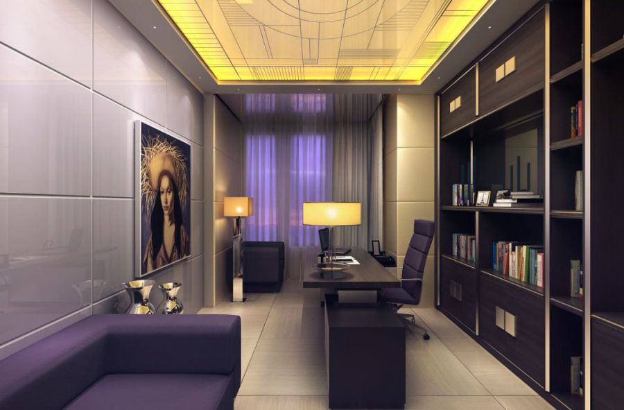 Дизайн кабинета выполнен в серо-фиолетовых оттенках и больше тяготеет к минималистичному убранству. Более насыщенные краски сосредоточены в отделке мягкой мебели, стены выдержаны в светлых тонах. Темно-коричневые шкафы и стол привлекательно контрастируют с настенными панелями – фактурными золотистыми и глянцевыми серыми. Желтый витражный потолок с геометрическим рисунком и встроенными светодиодами наполняет рабочую комнату теплым и комфортно рассеянным светом.