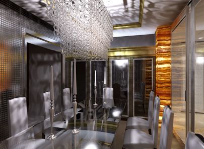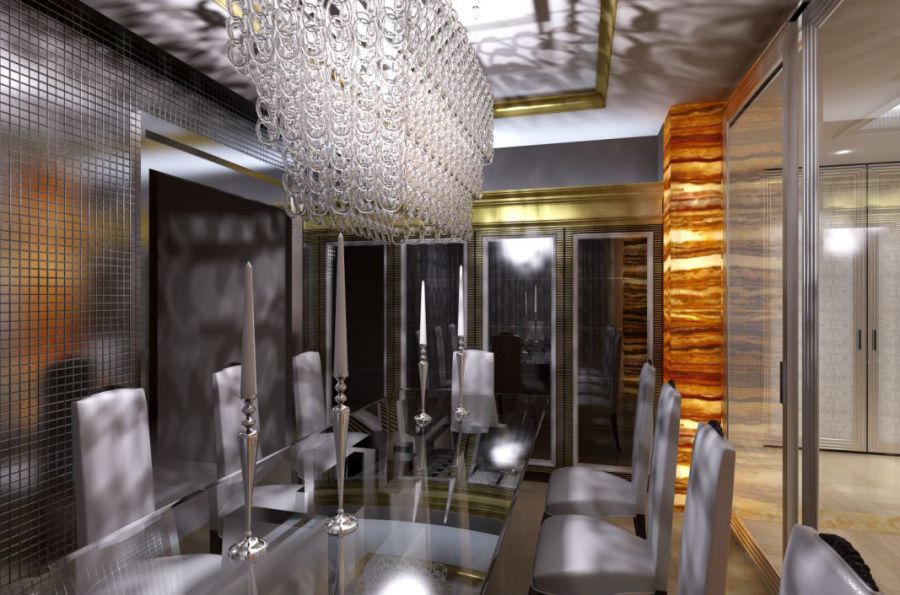 Богатый дизайн столовой акцентирован золотыми и серебристыми вставками – стены отделаны сияющей мозаикой под серебро, высокими зеркалами в позолоченных рамах, темной золотой канвой выделена потолочная ниша. С великолепным декором интересно контрастирует оформление столовой группы, очень сдержанное и построенное на простых линиях. Финальный штрих – крупная трехъярусная люстра из хрустальных колец, повторяющая контур обеденного стола.