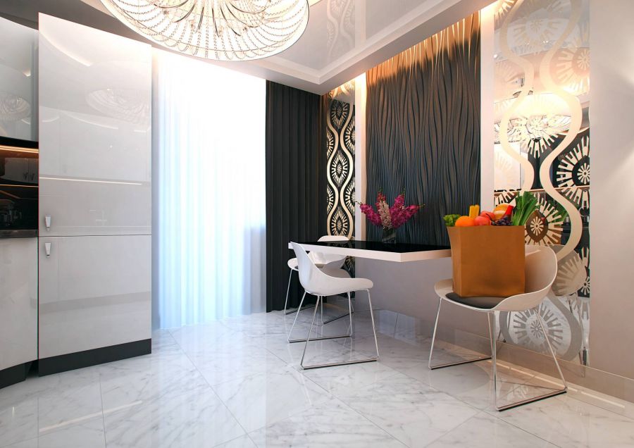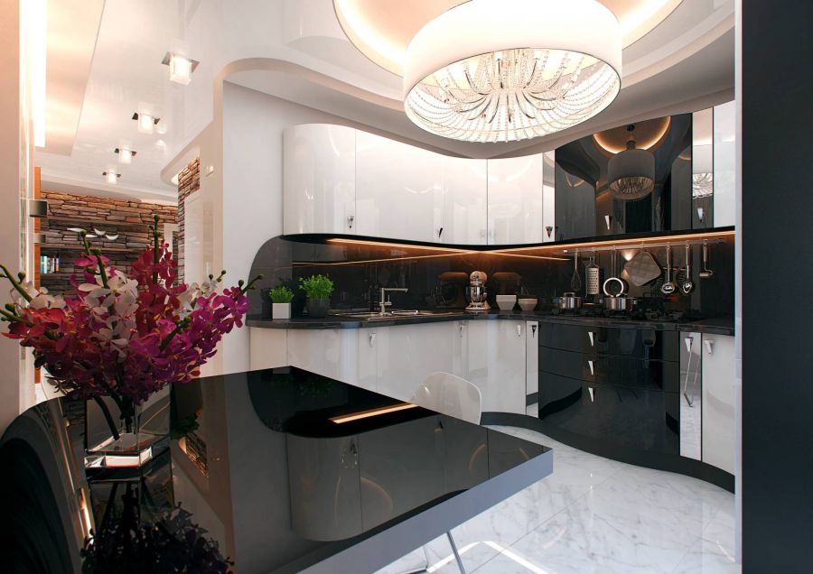 Глянцевая черно-белая кухня в проекте яркого интерьера квартиры полна динамичных контрастов. Помимо стильного цветового решения здесь соревнуются плавные линии кухонных фасадов и строгая прямолинейность обеденного стола, гладкие стены и черный рельефный участок в зоне обеденной группы. Симметричные зеркальные панели и люстра с хрустальными подвесками добавляют легкий гламур.