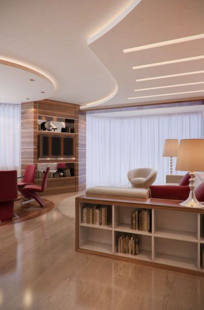 Границы зоны подчеркнуты потолочной конструкцией в виде окружности и напольным покрытием – более темным по сравнению с остальной поверхностью. Зона отдыха по проекту обозначена асимметричной потолочной конструкцией с параллельными щелями, идея которых продолжена в оформлении стены за диваном.