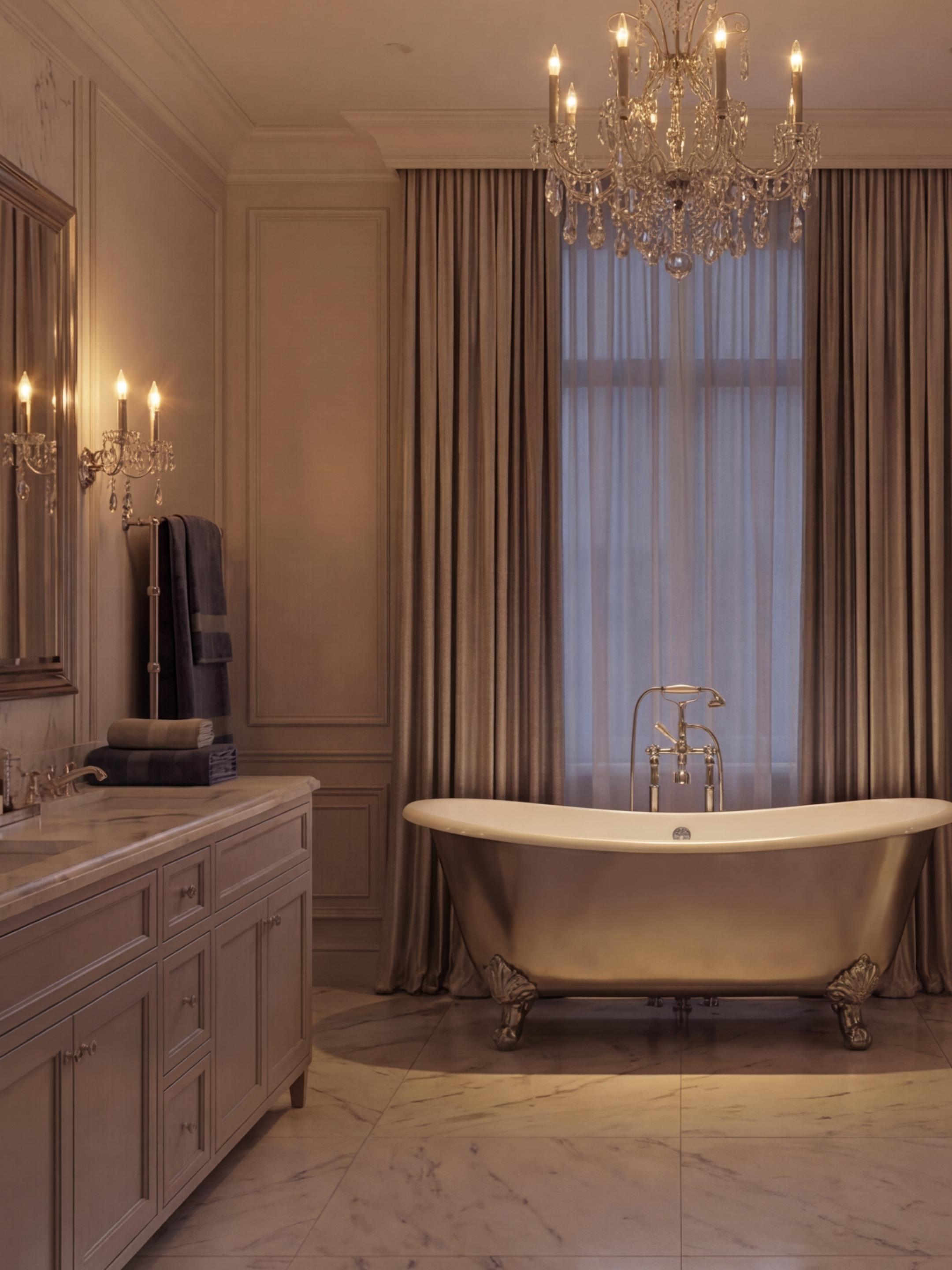 Ванная с отдельно стоящей ванной и люстрой