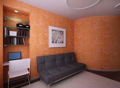 Спальня в дизайн-проекте интерьера 3-х комнатной квартиры насыщена глянцевыми плоскостями (молочные фасады платяного шкафа, графитовая панель за изголовьем кровати). Стена, за которой скрыт санузел, отделана множеством зеркальных фрагментов, в их центре – яркая картина. Ее оранжево-красную гамму достаточно поддержать дизайном подушек, чтобы насытить интерьер теплотой.
