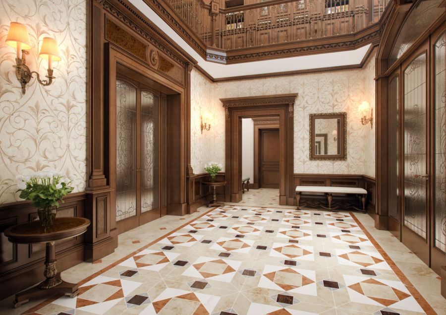 В интерьере дома в пастельных тонах из проекта 3-этажного особняка ведущий прием – комбинация узорчатых кремовых обоев с темно-ореховым деревом. Инкрустированный мраморный пол дополняет цветовое решение вариантами коричневого.