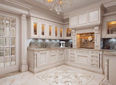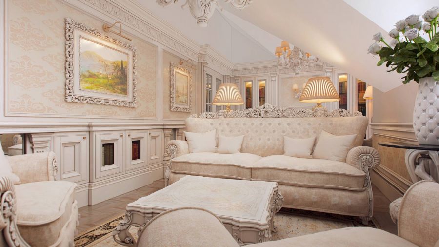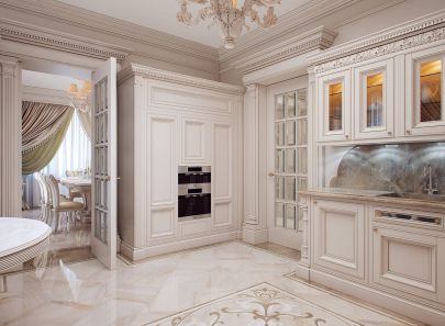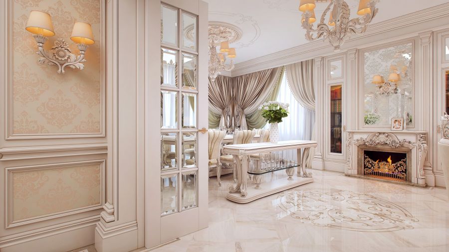 Мраморный пол цвета слоновой кости с орнаментом связывает гостиную и холл. Темно-бежевая окантовка по периметру повторяет очертания объемных настенных пилястр и каминного портала. Классическая потолочная лепнина перекликается с резьбой на белой мебели. Стулья с кремовой обивкой и массивный обеденный стол создают роскошный ансамбль в дворцовом стиле.