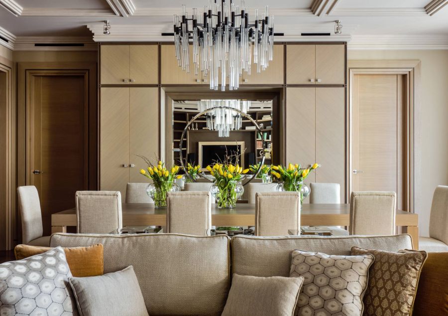 Зона отдыха и столовая планировочно объединены в парадное пространство. Логическую границу обозначает украшенный лепниной камин с зеркальной панелью. Рисунок зеркала повторяет мотивы настенных обоев нежного кремового оттенка, которые стали лейтмотивом в отделке всех помещений.
