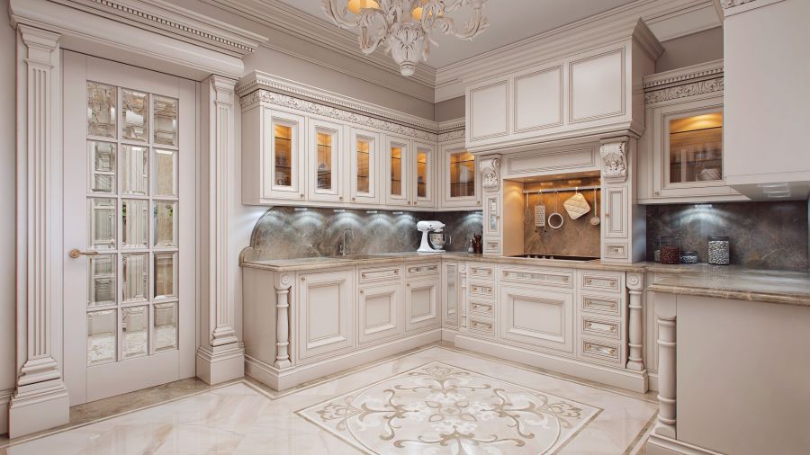 Помещение сообщается как с холлом, так и со столовой через остекленные распашные двери. Цветовой акцент – серо-коричневый мраморный фартук. Смягчают доминирующую белую палитру светло-абрикосовые абажуры люстры и теплая желтая подсветка шкафов.