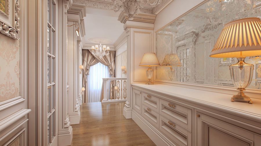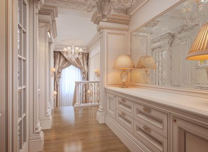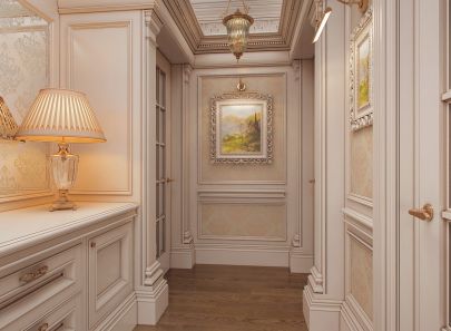Оформление проходных пространств максимально интегрировано в стилистику квартиры. Зеркала в резных рамах, фигурные подставки под вазоны, стеновые панели с молдингами, встроенная мебель с филенками, пейзажные картины – дополнения, которые обогащают классический интерьерный стиль.