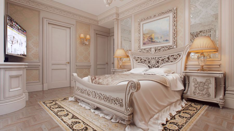 Деликатная отделка создает благоприятный фон для расслабляющей атмосферы. В центре внимания – великолепная резная кровать из массива в комплекте с такими же эксклюзивными парными тумбами. На выбеленном паркете выигрышно выделяется контрастный коричнево-бежевый ковер.