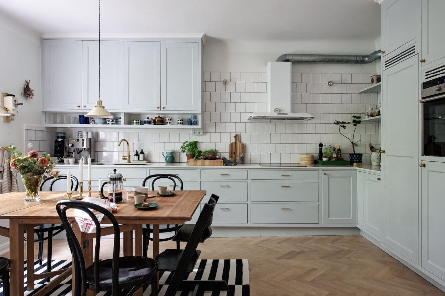Комбинация с белым цветом в дизайне стен, шкафов, фартука помогает избежать однообразия. А включение неокрашенного дерева (обеденный стол, пол, элементы мебели) разбавляет интерьер теплыми текстурами.