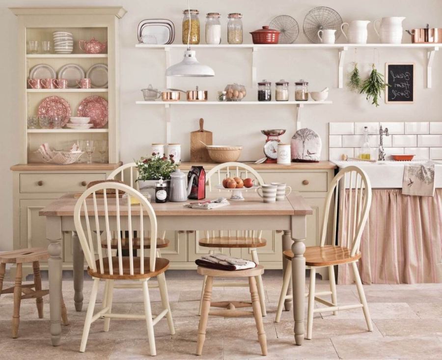 Пример кухни в стиле шебби-шик демонстрирует, насколько тонкой и интересной может быть игра очень близких оттенков при правильной расстановке акцентов.