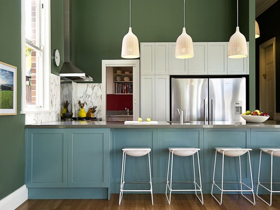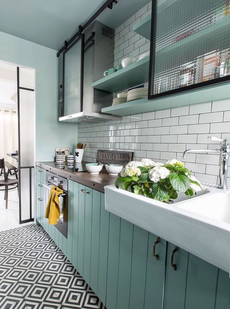 Самый простой способ ввести цвет – использовать окрашенные фасады кухонного гарнитура. Усилить эффект поможет подобранная в тон бытовая техника (холодильник, духовой шкаф, микроволновая печь). Мягкая гамма обеденной группы впишется в любую стилистику: классику, ретро, минимализм.